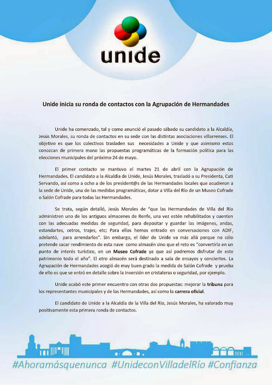 El primer contacto se mantuvo el martes 21 de abril con la Agrupación de Hermandades. El candidato a la Alcaldía de Unide, Jesús Morales, trasladó a su Presidenta, Cati Servando, así como a ocho a de los president@s de las Hermandades locales que acudieron a la sede de Unide, una de las medidas programáticas, dotar a Villa del Río de un Museo Cofrade o Salón Cofrade para todas las Hermandades.